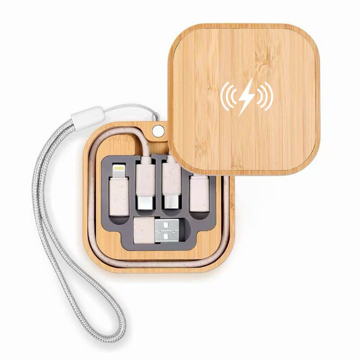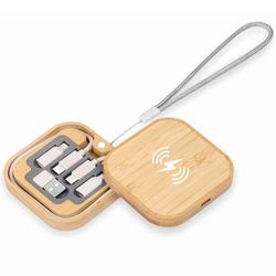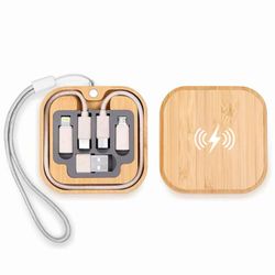 The 5-in-1 ECO charging cable kit with a built-in wireless charger provides a smart, all-in-one charging solution. Compatible with multiple devices, it keeps you powered on the go. Compact and convenient for travel or desk use, it can be customized with your logo or message for a practical promotional accessory.