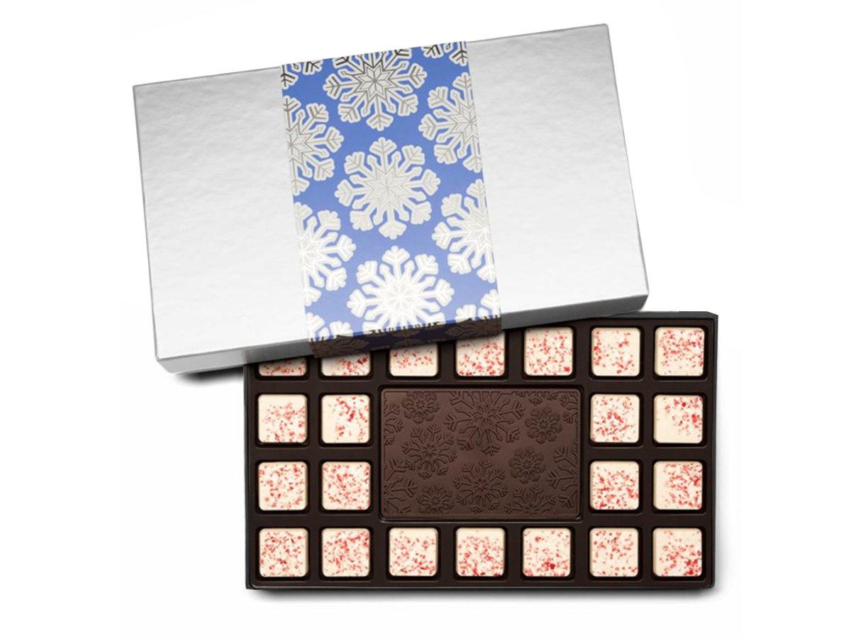 Celebrate the magic of the season with our 23-Piece Peppermint Bark Gift Set. A dazzling holiday treat as beautiful as it is delicious. Each piece features layers of creamy white chocolate and rich dark chocolate, topped with crisp peppermint candy pieces that sparkle like fresh-fallen snow.
