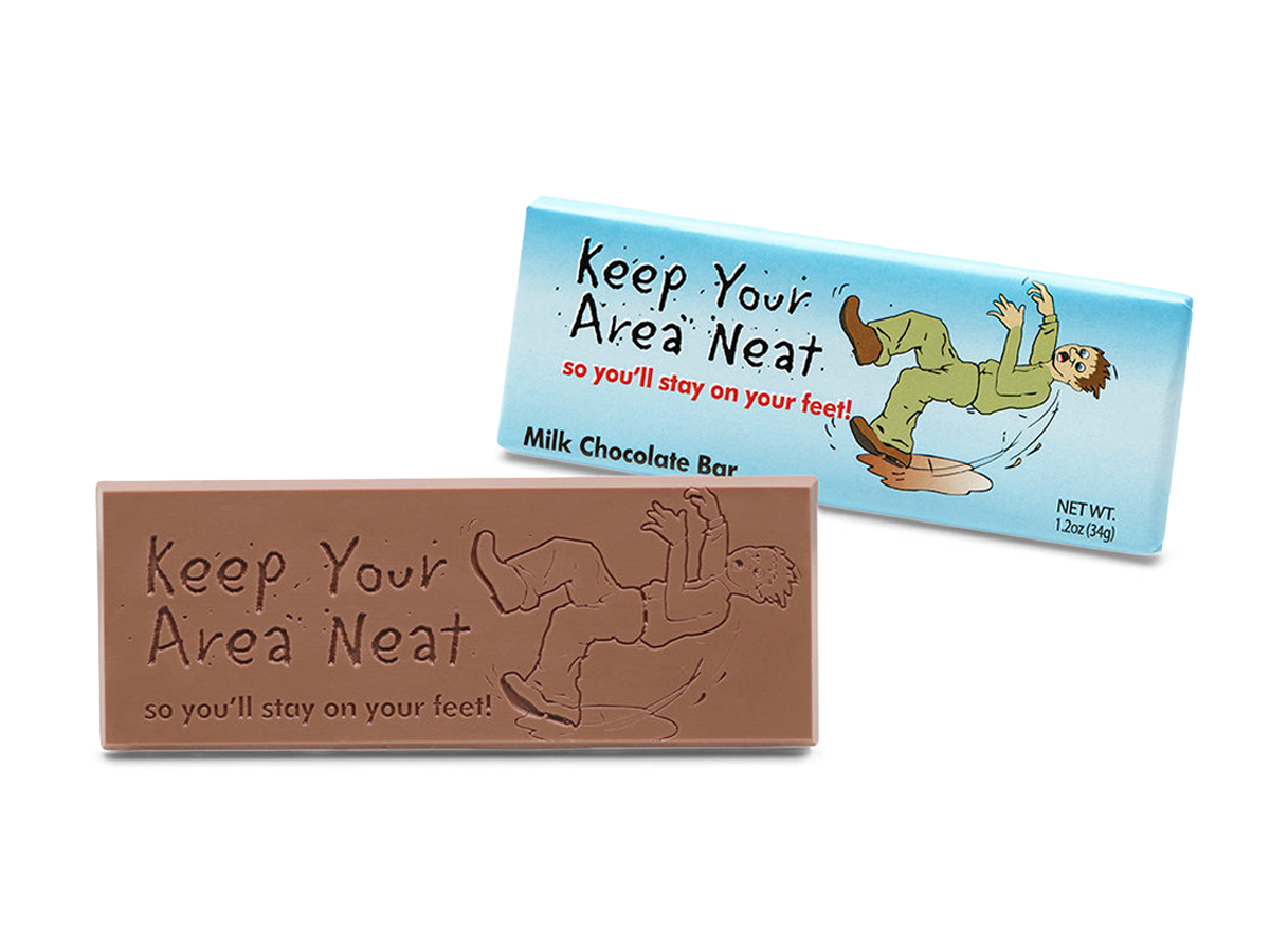Keep things tidy and morale high with our "Keep Your Area Neat" Milk Chocolate Wrapper Bar. This creamy, premium milk chocolate bar delivers a sweet reminder to maintain a clean and organized workspace. Perfect for safety programs, employee appreciation, or workplace giveaways.